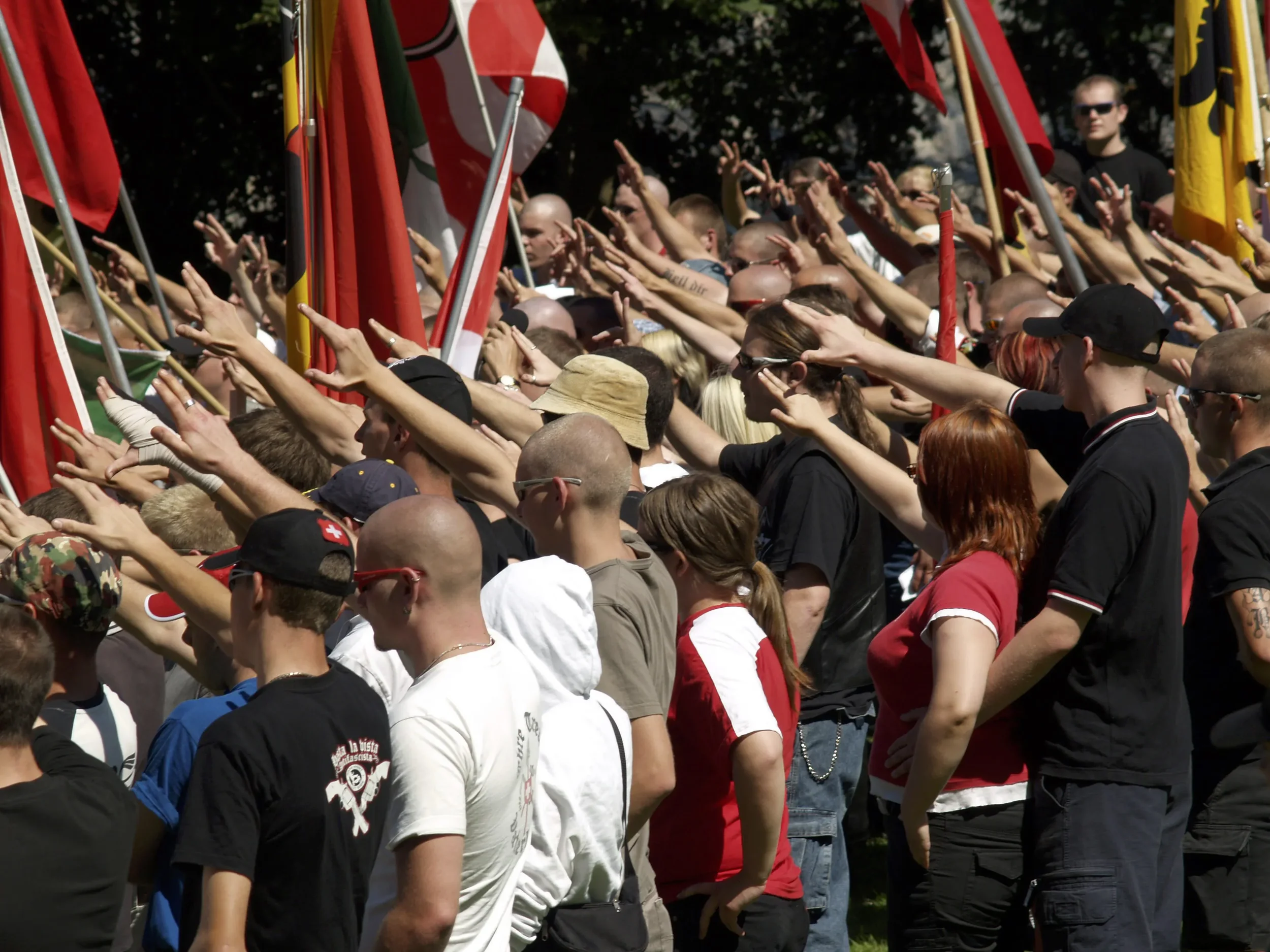 The Nazi or Hitler salute started in 1930s Nazi Germany to honor Adolf Hitler. It involves raising the right arm straight with the palm down. People often said "Heil Hitler" or "Sieg Heil" while doing it. After World War II, neo-Nazis and white supremacists kept using this salute, making it the most common white supremacist hand sign worldwide.